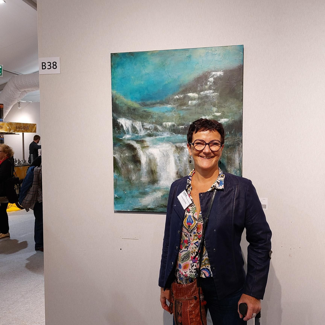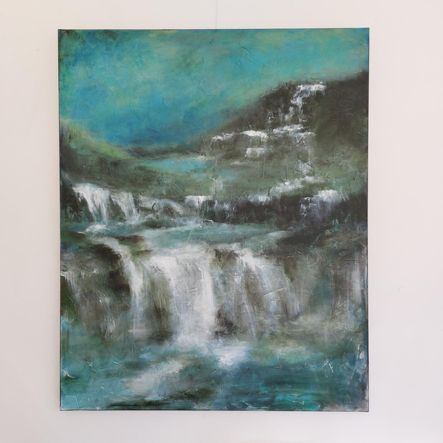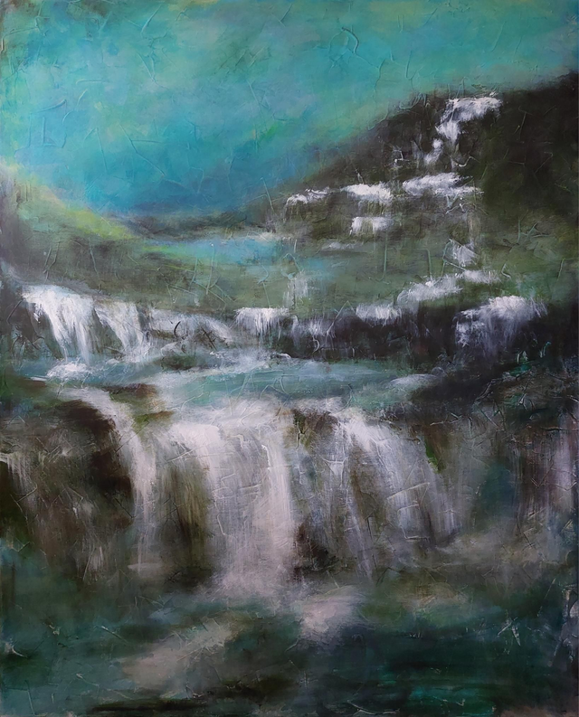 Cascades III ou Power of waterfalls. Peinture Acrylique sur Toile de lin, 100cmx81cm, 2025, Cascades imaginaires. Livré avec Certificat d'authenticité. Création originale Patricia DELORME Artist