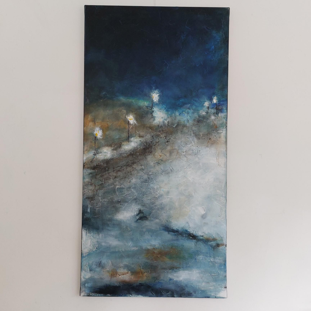 Peinture Acrylique sur Toile de lin, 120cmx60cm, 2025. Nuit d'hiver, lampadaires éclairés, neige. Livré avec Certificat d'authenticité. Création originale Patricia DELORME Artist