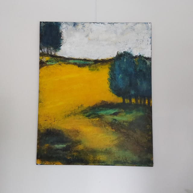 Peinture Acrylique sur Toile de lin, 92x73cm, 2025. Paysage imaginaire, campagne, nature, arbres bleus, champs oranges jaunes. Livré avec Certificat d'authenticité. Création originale Patricia DELORME Artist