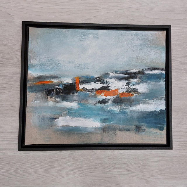 Peinture Acrylique sur Toile, 38cmx46cm, 2025. Paysage hivernal sous inspiration Nicolas de Stael. Abstraction. Vendu encadré avec caisse américaine noire. Livré avec Certificat d'authenticité. Création originale Patricia DELORME Artist