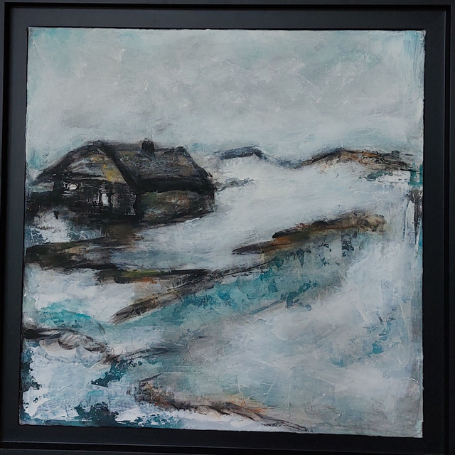 Peinture Acrylique sur Toile, 40cmx40cm, 2023, Vendu encadré avec caisse américaine noire. Paysage de montagne, paysage enneigé, neige, maison, refuge. Couleur bleu, blanc, gris marron. Livré avec Certificat d'authenticité. Création originale Patricia DELORME Artist