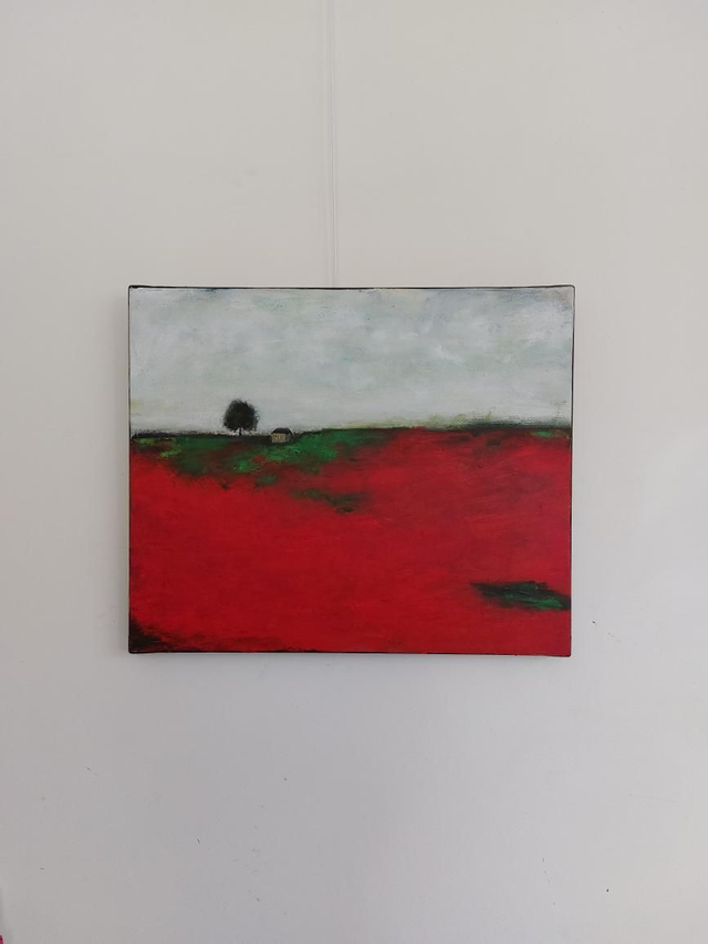 Peinture Acrylique sur Toile de lin, 38x46cm, 2025. Champs, coquelicots, arbre, maison. Livré avec Certificat d'authenticité. Création originale Patricia DELORME Artist