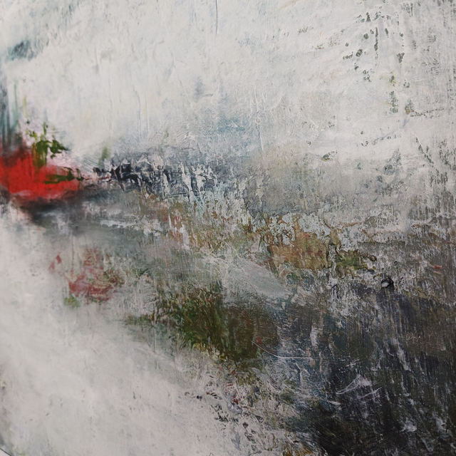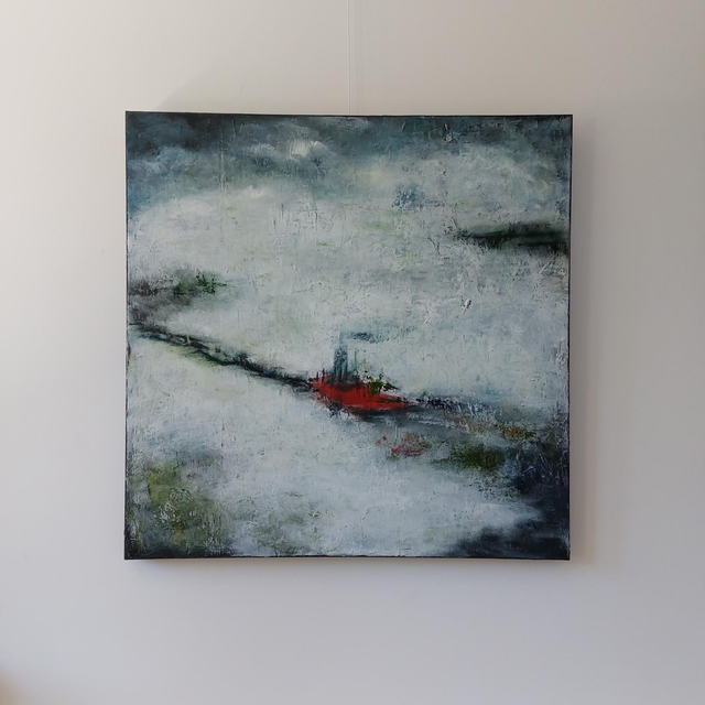 Peinture Acrylique sur Toile, 80cmx80cm, 2023, Paysage arctique, blanc, brise glace rouge, à la limite de l'abstraction. Tableau ayant été sélectionné et exposé au Salon des Beaux-Arts à Paris en 2023. Livré avec Certificat d'authenticité. Création originale Patricia DELORME Artist